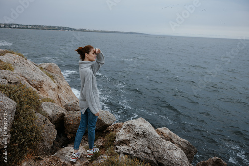 beautiful woman nature rocks coast landscape Ocean Lifestyle
