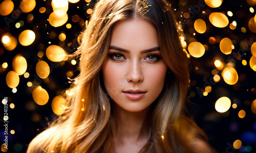 Beautiful woman on a golden background. Selective focus.