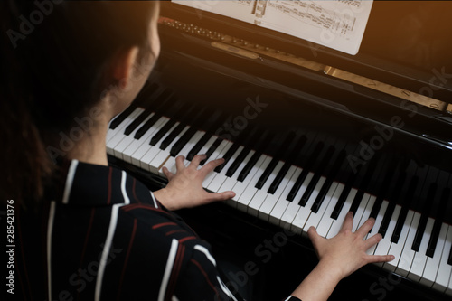 Beautiful woman playing piano, learn to play piano.