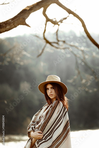 beautiful woman portrait wearing hat and poncho at tree near river, american outfit, boho concept