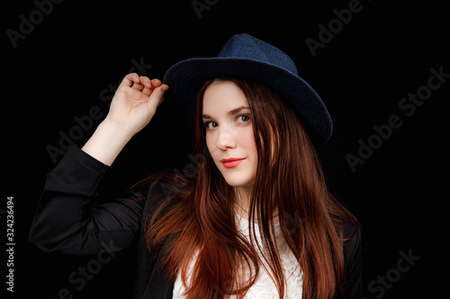 Beautiful woman portrait with a big hat. Vintage look. Fashion makeup. The hat covers part of the face
