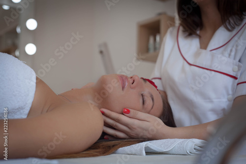 Beautiful woman receiving head massage at spa .