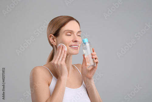 Beautiful woman removing makeup with cotton pad on gray background, space for text
