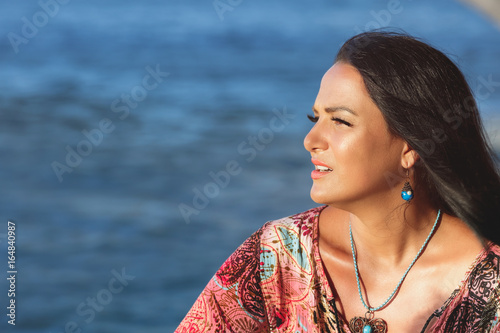 Beautiful woman sitting on the beach and watching the ocean. Side view of beautiful woman in dress sitting on the beach at sunset and looking away