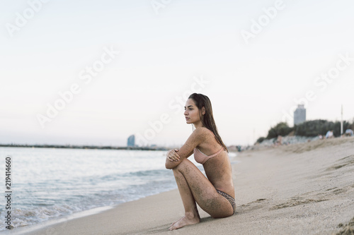 Beautiful woman sitting on the beach, looking at the sea