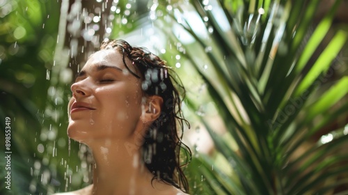 beautiful woman taking a bath in a nature style bathroom, glamping or ecological hotel