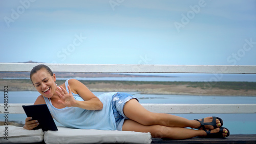 Beautiful woman talking on video chat while lying on the terrace by the sea