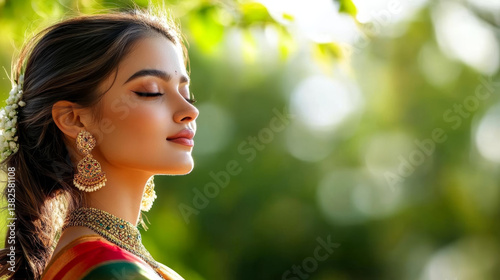 Beautiful woman with closed eyes, wearing traditional jewelry and colorful attire, exuding