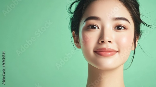 Beautiful Woman with Flawless Skin Smiling against a Green Background.