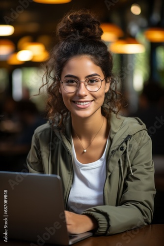 Beautiful woman with glasses sits at her desk and works on laptop in modern office, freelance, businesswoman, work in company, profession