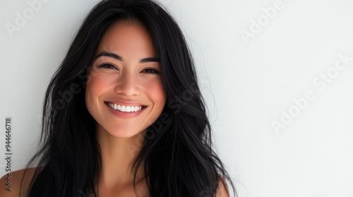 Beautiful woman with long black hair poses against a white wall backdrop, ideal for commercial use or banner ads. The clean background accentuates her striking features.
