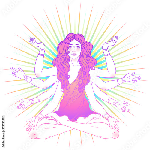 Beautiful woman with long hair and multiple hands sitting in lotus yoga position. Multi-armed goddess is Goddess Lakshmi, the Hindu goddess of wealth, fortune, and prosperity. Vector detailed isolated