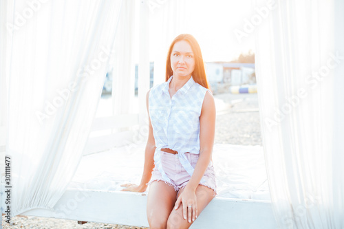 beautiful woman with long hair walks on the sea beach at dawn