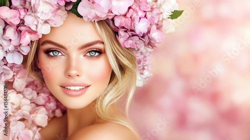 Beautiful Woman with Pink Flowers Crown Blonde Hair Makeup Beauty