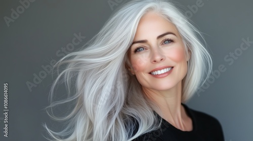 Beautiful woman with white hair, long straight shiny silver and platinum gray-colored hair, shiny and beautiful, hair flowing in the wind, she has bright blue eyes