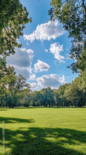 beautiful wooded park with a blue sky with clouds with copy space vertically 9:16