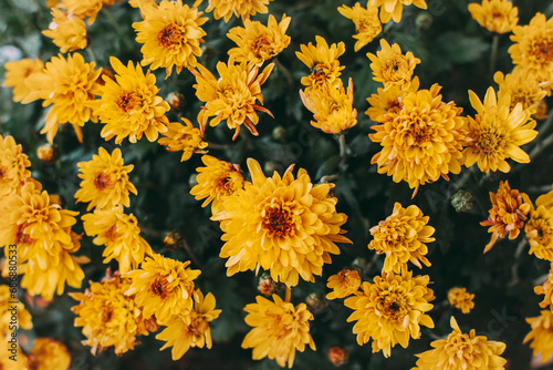 Beautiful yellow chrysanthemum flowers on a dark background.