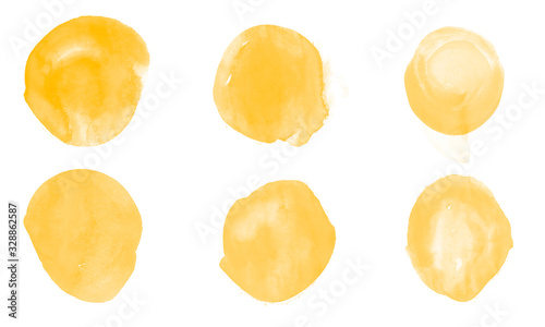 Beautiful yellow watercolor blot background. Set of yellow circles brushes
