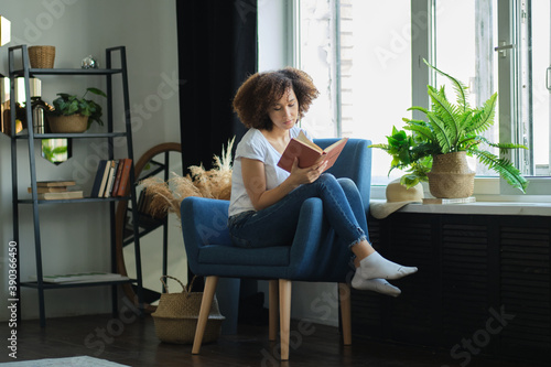 Beautiful young African American woman reading a book lying comfortably on her back on a armchair in the living room in her jeans
