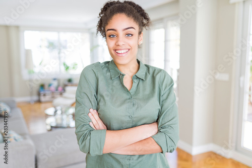 Beautiful young african american woman smiling friendly with crossed arms looking at the camera with big smile