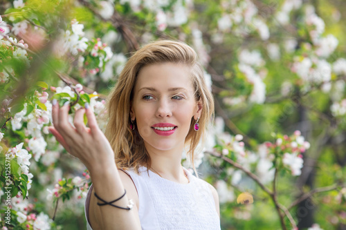 Beautiful young and happy woman close-up portrait on the background of a blooming Apple tree