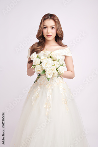 Beautiful young asian woman in wedding dress holding bouquet on white background,