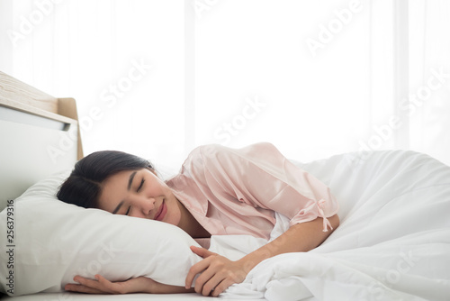 Beautiful young asian woman peacefully and comfortable sleeping on the bed with white duvet having relaxing happy day dream in the morning feeling the soft pillow, copy space
