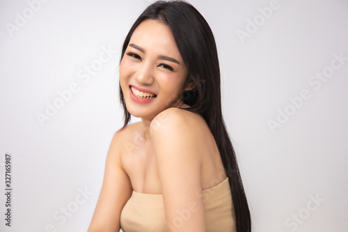 Beautiful Young Asian Woman short hair with Clean Fresh Skin. Face care, Facial treatment, Cosmetology, beauty and healthy skin and cosmetic ideas concept.pretty woman .beauty skin isolated on