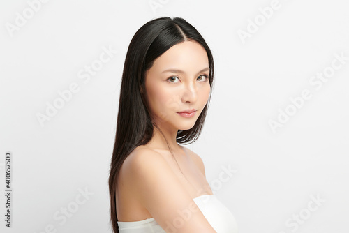 Beautiful young asian woman with clean fresh skin on white background, Face care, Facial treatment, Cosmetology, beauty and spa, Asian women portrait.