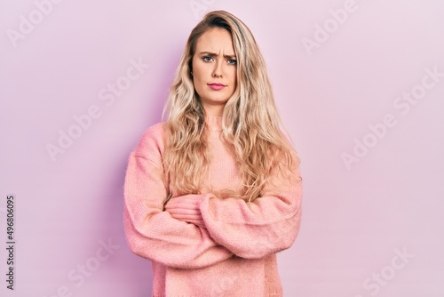 Beautiful young blonde woman wearing pink sweater skeptic and nervous, disapproving expression on face with crossed arms. negative person.