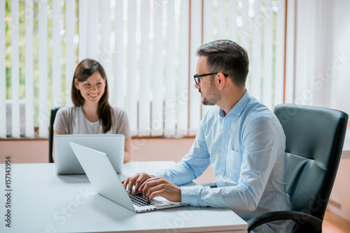 Beautiful young business partners are using a laptop, discussing project and smiling while working in office.