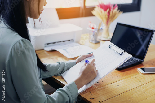 Beautiful young businesswoman doing some paperwork while sitting at office desk in front of computer.