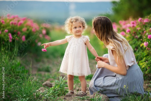 Beautiful young child girl with mother are wearing casual clothes sitting in a garden with pink blossom roses