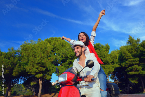 Beautiful young couple in love enjoying and having fun riding on a scooter