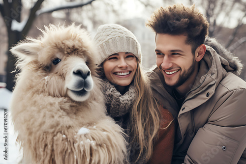Beautiful young couple in winter clothes having fun with llama in winter park
