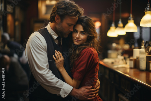 beautiful young couple man and woman embracing in a restaurant or bar, classic period clothing