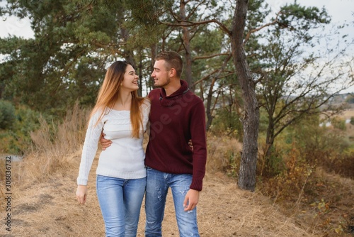 Beautiful young couple walking in autumn park.