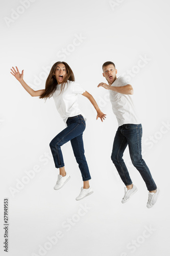 Beautiful young couple's portrait isolated on white studio background. Facial expression, human emotions, advertising concept. Copyspace. Woman and man jumping, dancing or running together.