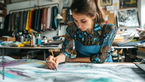 beautiful young fashion designer drawing sketches on paper at workplace in studio