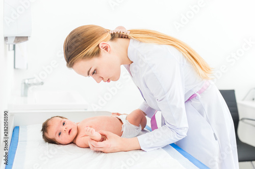 Beautiful young female blonde pediatrician doctor examines baby girl checking her skin