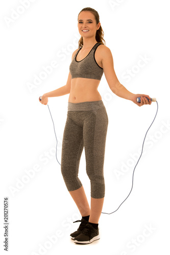 Beautiful young fit woman works out with speed rope isolated over white background