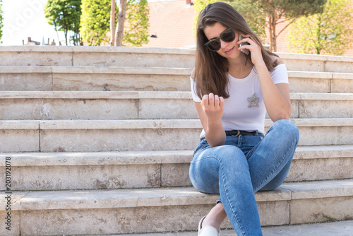 Beautiful young girl is sitting on the stairs with mobile phone
