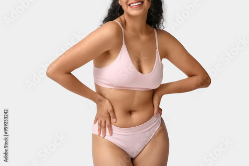 Beautiful young happy African-American body positive woman on grey background, closeup