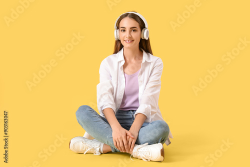 Beautiful young happy woman in headphones sitting on yellow background