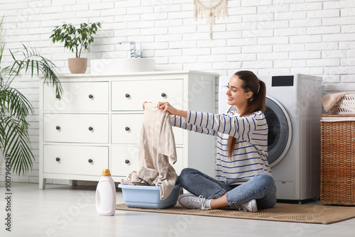 Beautiful young happy woman with basin of clean laundry and detergent sitting at home
