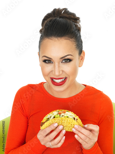 Beautiful Young Hispanic Woman With Crispy Chilli Beef Tacos
