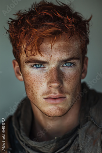 beautiful young man with red hair and freckles, featuring a very short undercut on the sides, blue eyes, and a grey background