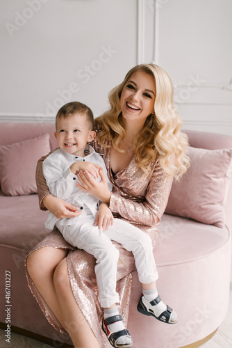 Beautiful young mother and son cuddle and play in smart clothes at home