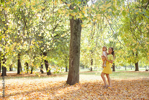Beautiful young mother with her little daughter in park. Mother kissing her child outdoors. Family playing in autumn park.