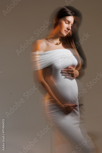 Beautiful young pregnant brunette girl. A woman waiting for a baby in a white dress with bare shoulders in the studio. Artistic smudges in the photo